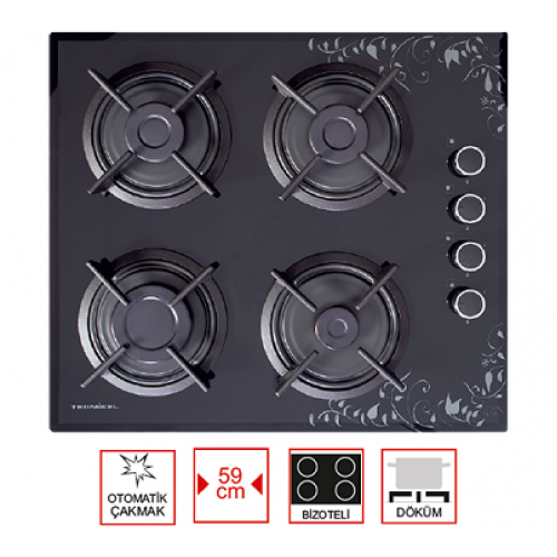 4 gözü gazlı, 59 cm bizoteli cam ankastre ocak