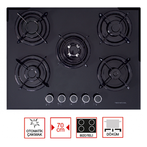 5 gözü gazlı, 70 cm bizoteli cam ankastre ocak