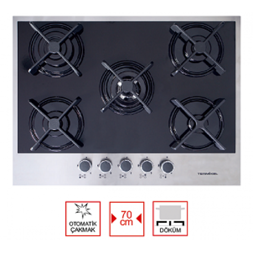 5 gözü gazlı, 70 cm inox dekorlu cam ankastre ocak